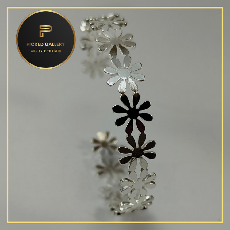 این دستبند نقرهای زیبا با طراحی گلهای ظریف و مینیمال، جلوهای لطیف و چشمنواز دارد. گلهای حکاکیشده بر روی این دستبند به صورت متوالی چیده شدهاند که حالتی هماهنگ و یکپارچه ایجاد کرده است.