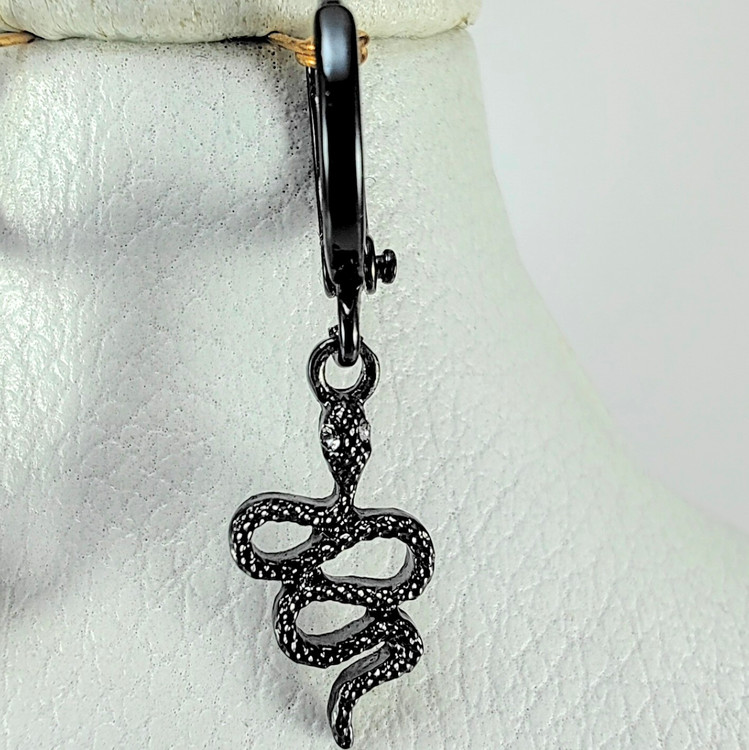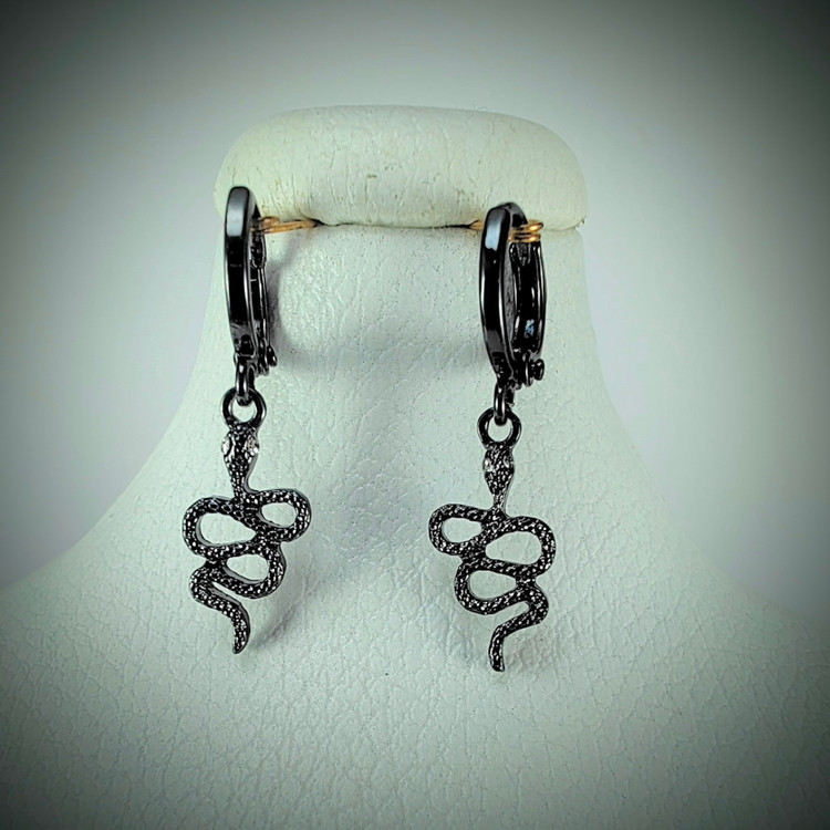 این گوشوارههای جذاب با طرح مار و رنگ مشکی براق، جلوهای خاص و اسرارآمیز دارند. طراحی مار که سمبل قدرت، تحول و زیبایی مرموز است، در کنار نگینهای ریز درخشان، جلوهای منحصربهفرد به این زیورآلات داده است.