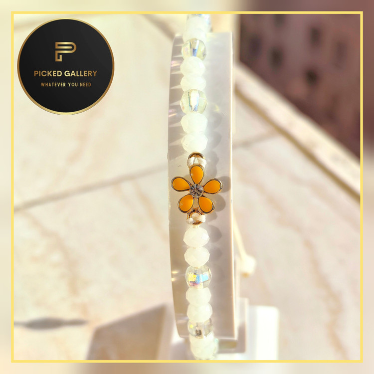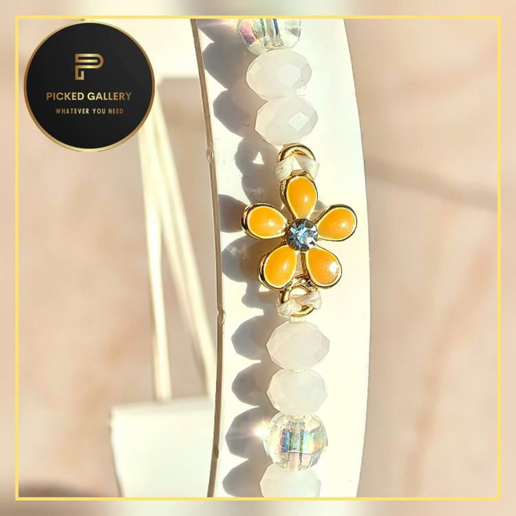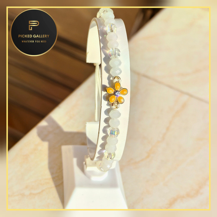 این دستبند زیبا با طراحی گل زرد و سنگهای کریستالی، نمادی از لطافت و زیبایی طبیعت است. ترکیب رنگ زرد طلایی با سنگهای براق، جلوهای چشمنواز به این اکسسوری بخشیده و آن را به گزینهای جذاب برای استفاده روزمره و مجالس تبدیل کرده است.