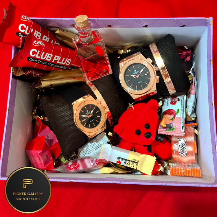 محتویات پک: ست ساعت هابلوت رزگلد، ست بنگل رومن ، بطری عشق ، جاسوئیچی و انواع شکلات