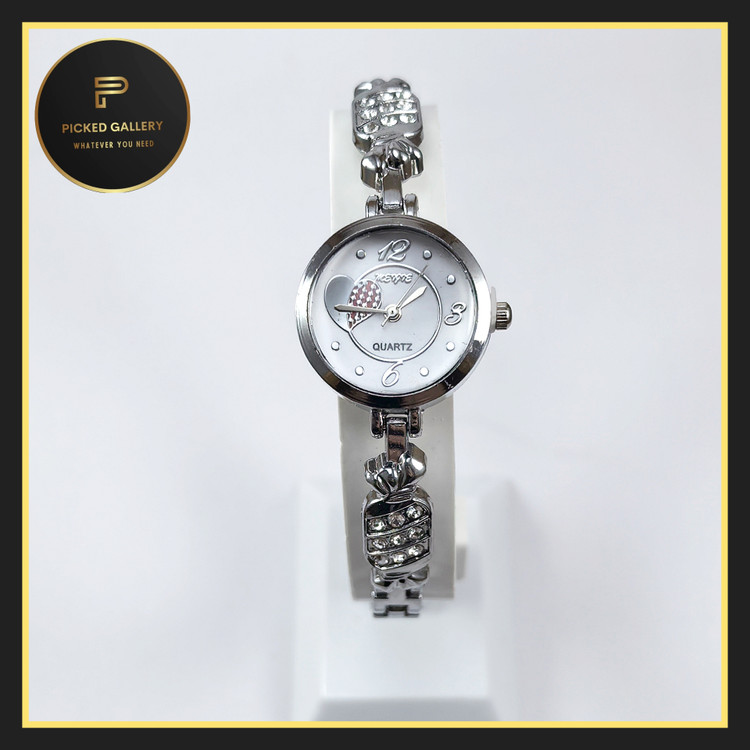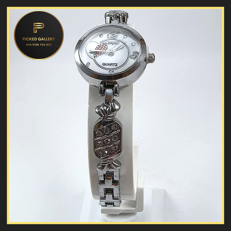 2. **بند و قاب:** بند فلزی با جزئیات براق و سنگهای زینتی درخشان، جذابیت خاصی به ساعت بخشیده است. این بند بهگونهای طراحی شده که هم استحکام دارد و هم راحت روی مچ دست قرار میگیرد.